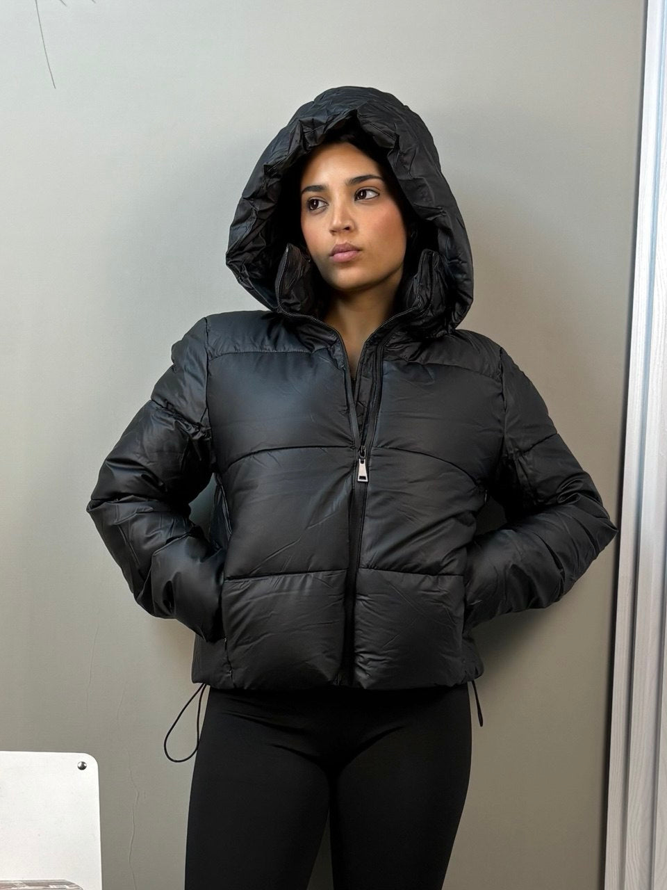Giubbino bomber nero dalla silhouette moderna e versatile. Dotato di cappuccio regolabile per proteggere dal freddo e tasche funzionali ai lati per riporre gli essenziali. Il tessuto resistente garantisce durabilità nel tempo, mentre il design essenziale si abbina facilmente a qualsiasi outfit. Perfetto per chi cerca un capo pratico e dallo stile contemporaneo, ideale per la stagione fredda e per un look casual-chic.