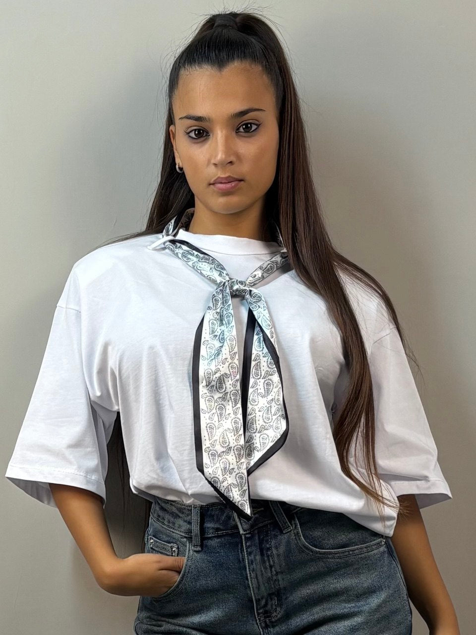 La tshirt foulard taglia unica con spalline over unisce stile e comfort in un capo versatile. Il design con spalline oversize aggiunge un tocco moderno, mentre la taglia unica si adatta facilmente a diverse conformazioni. Perfetta per un outfit casual e di tendenza, questa tshirt è ideale da abbinare sia a jeans che a gonne per un look fresco e originale della just west .